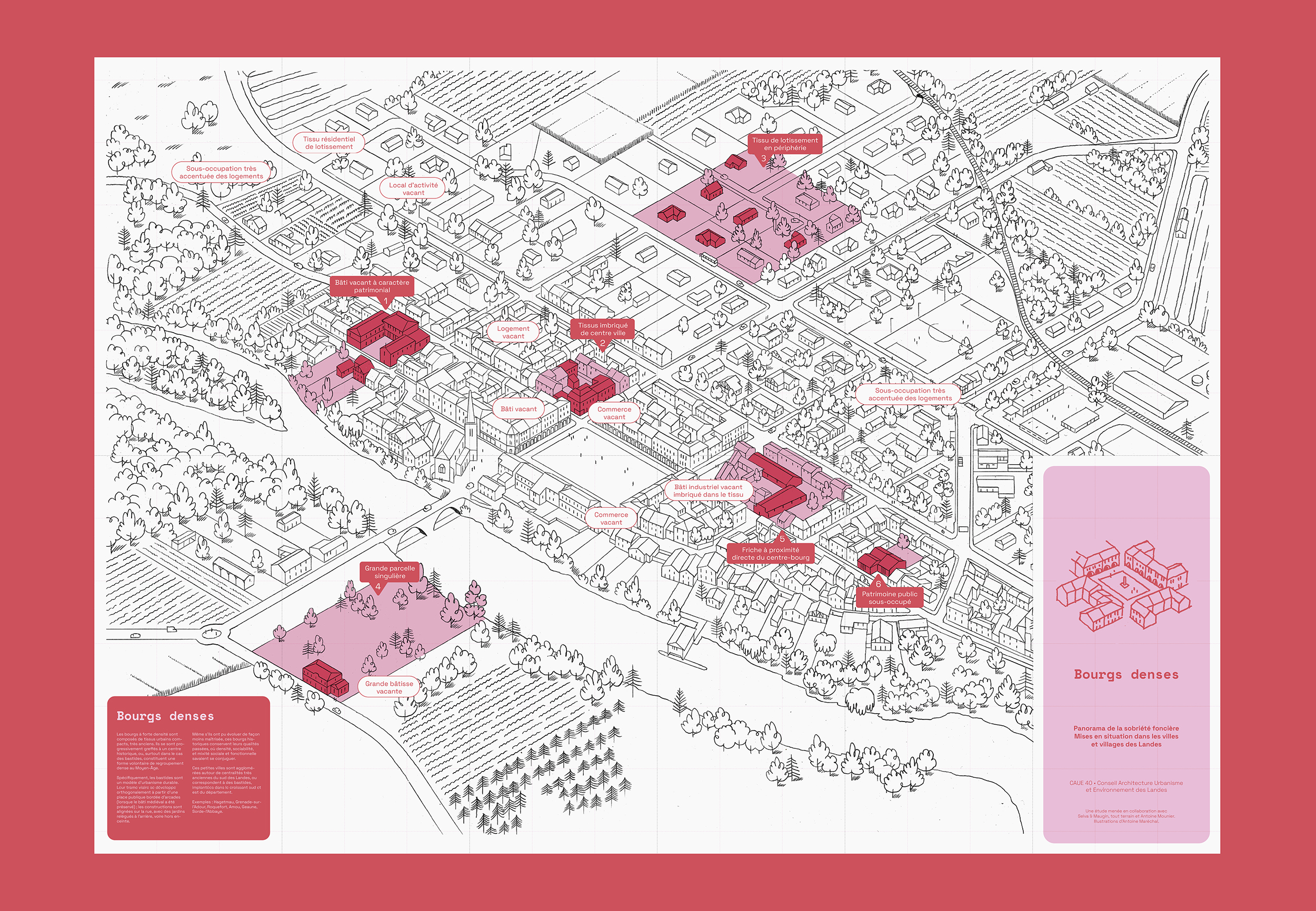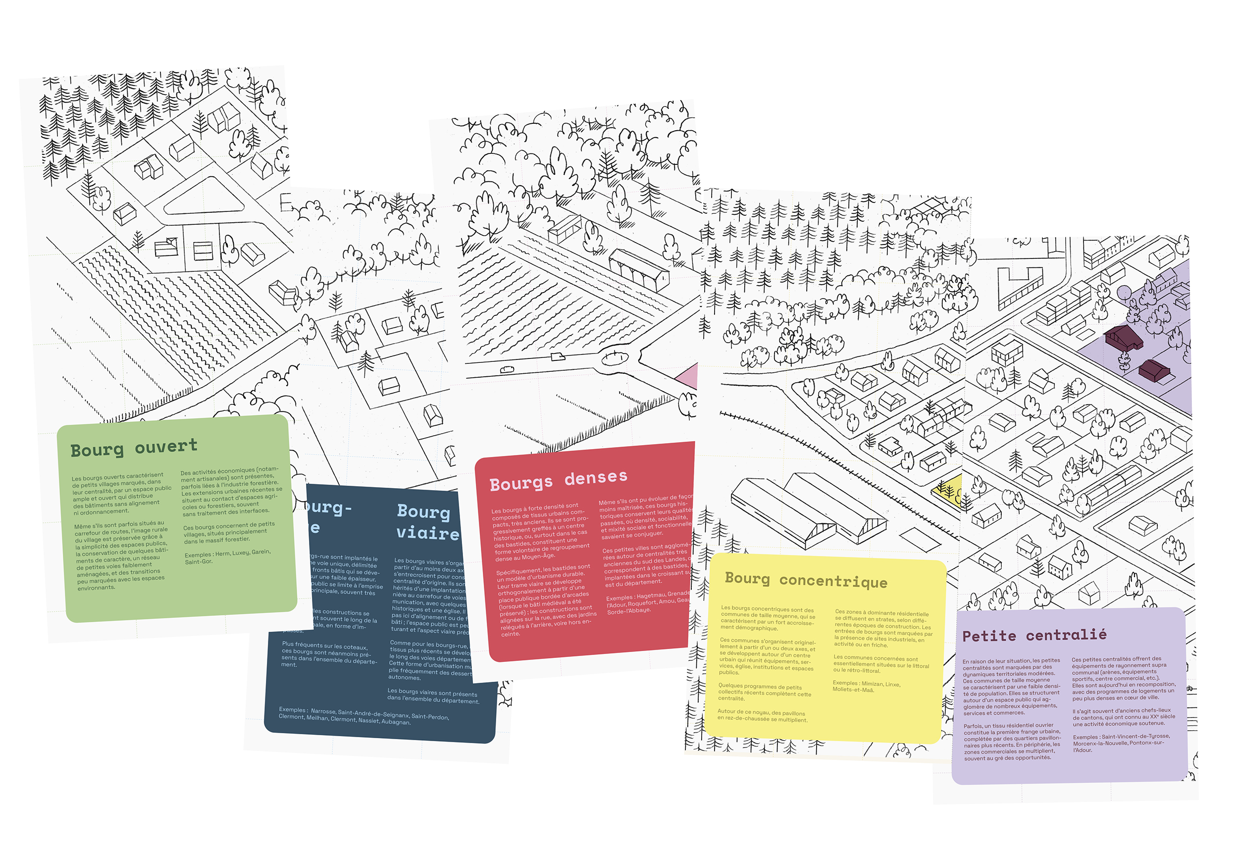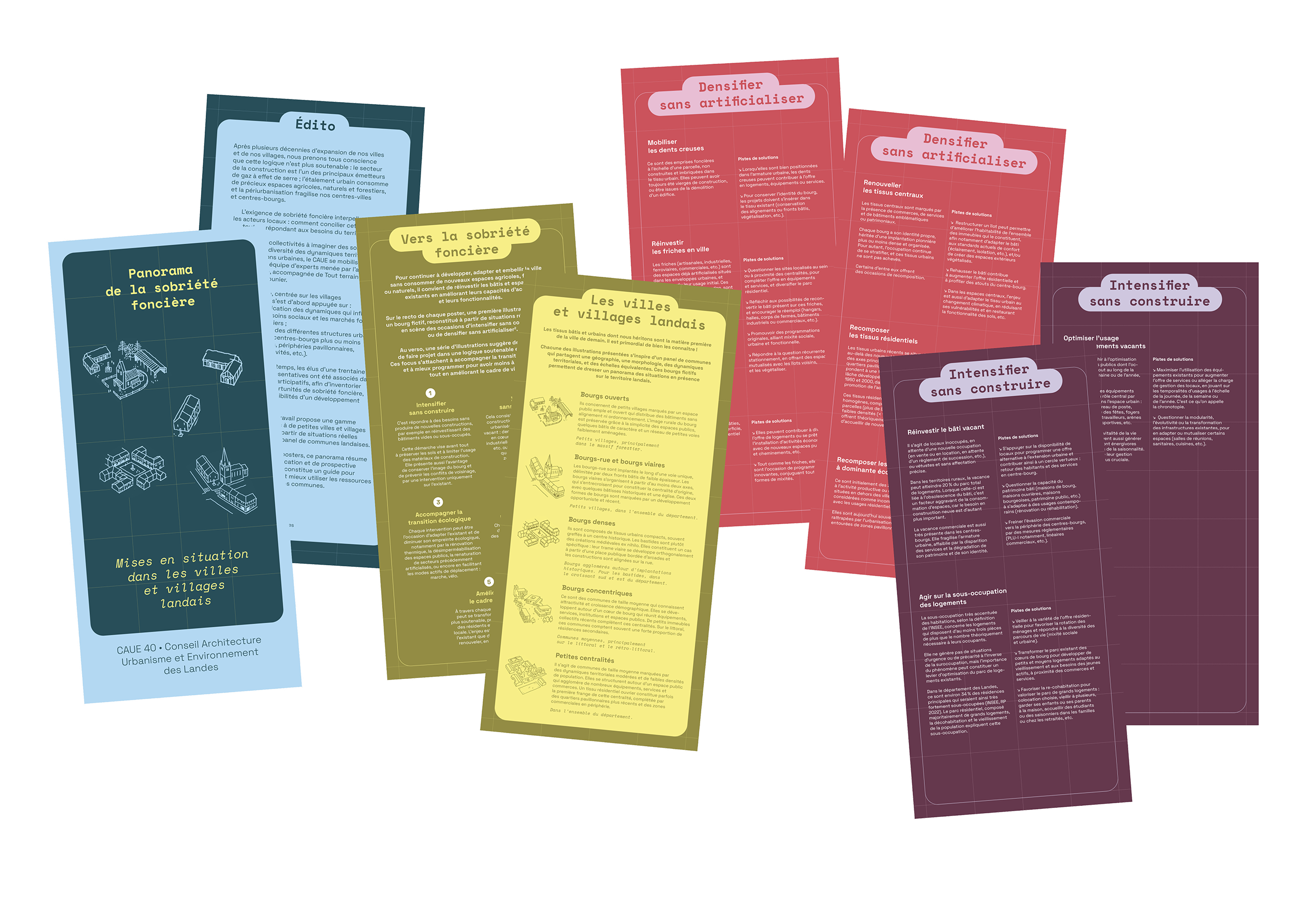 Conception graphique d'un kit de médiation à destination des élu·es du département des Landes, dans le cadre de l'étude portée par le CAUE 40 et menée par l'agence Selva & Maugin : Étude des formes urbaines des villes et villages Landais, et hypothèses de densification respectueuses de la qualité urbaine.