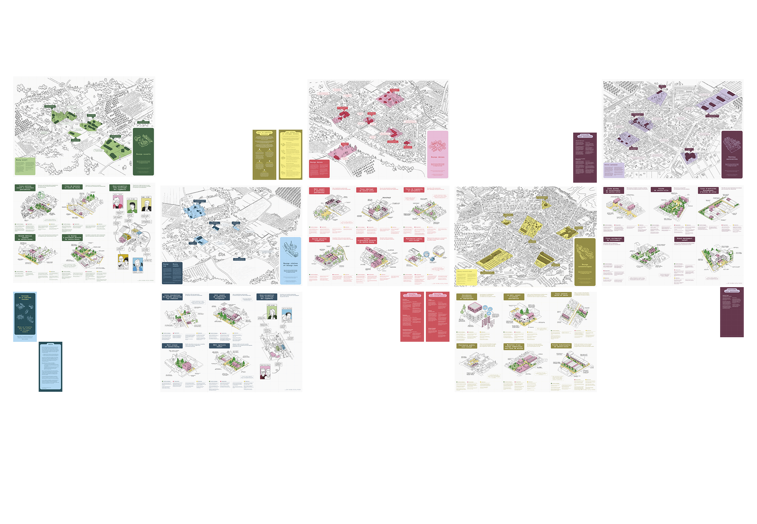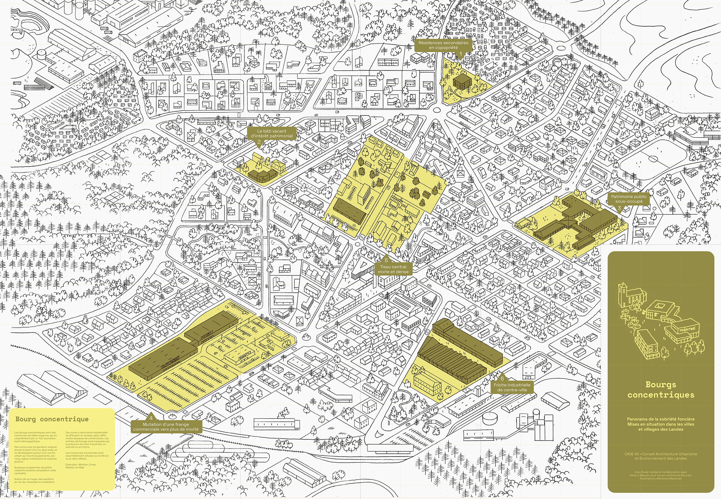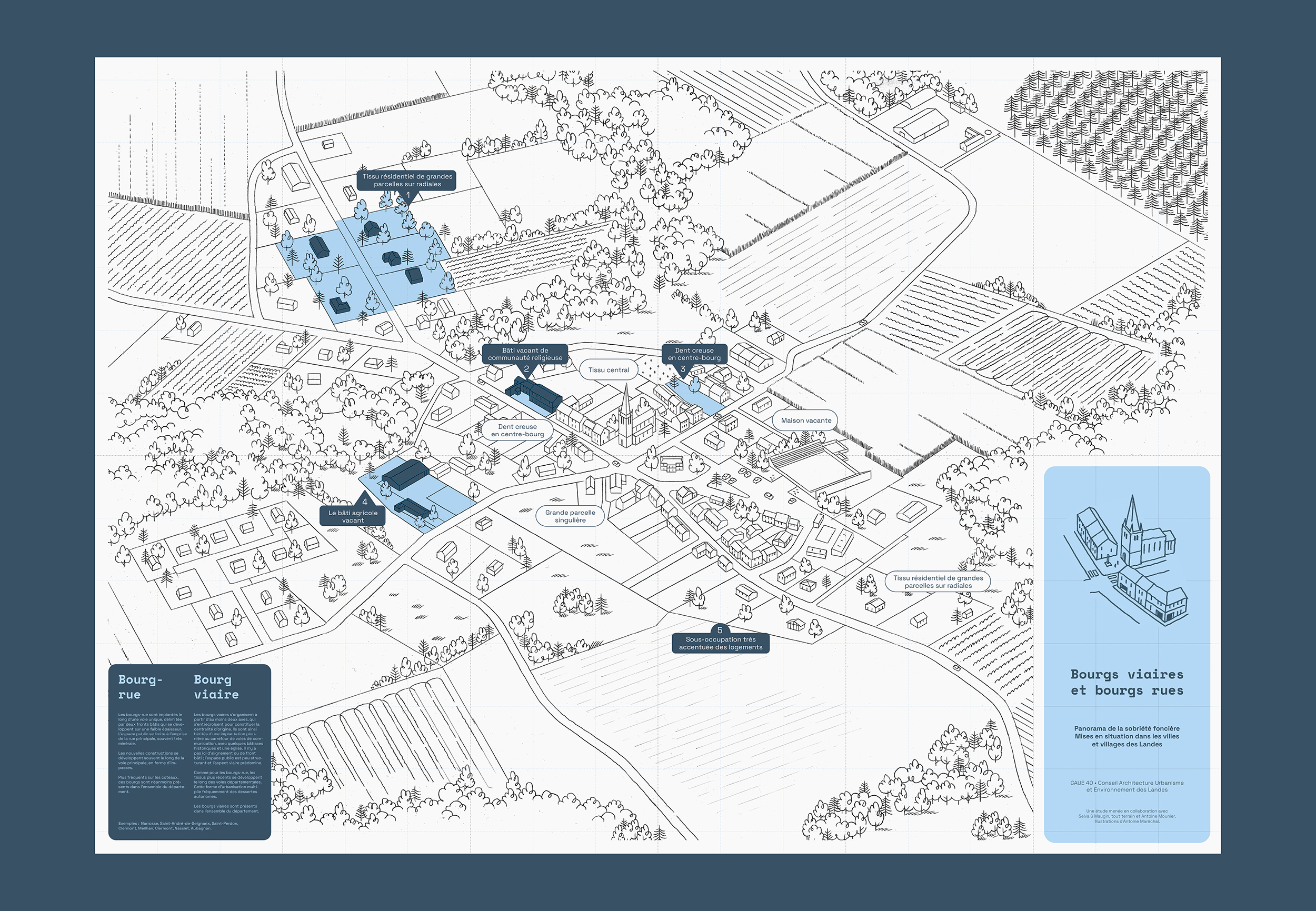 Conception graphique d'un kit de médiation à destination des élu·es du département des Landes, dans le cadre de l'étude portée par le CAUE 40 et menée par l'agence Selva & Maugin : Étude des formes urbaines des villes et villages Landais, et hypothèses de densification respectueuses de la qualité urbaine.